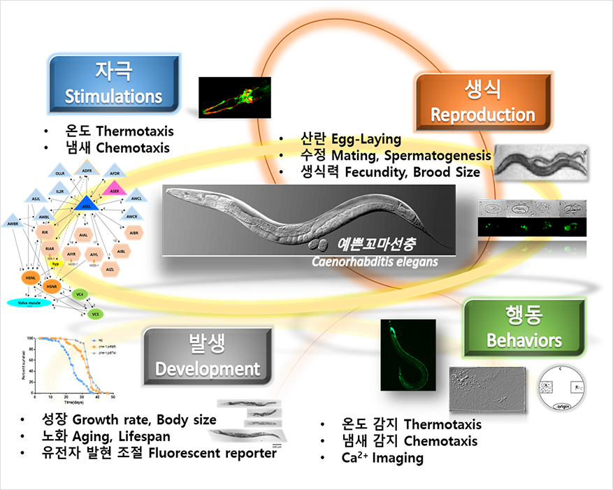 예쁜꼬마선충을 동물모델로 이용하여 어떻게 유전체가 유기체 생물을 발생시키고 생식을 위한 생존을 도모하는지 연구하고 있습니다. 특히, 칼슘과 그 결합단백질들에 의하여 형성되는 세포 생리적 변화에 의한 동물 발생 및 감각 신경계 연관 동물 행동 변화에 관심을 두고 있습니다.