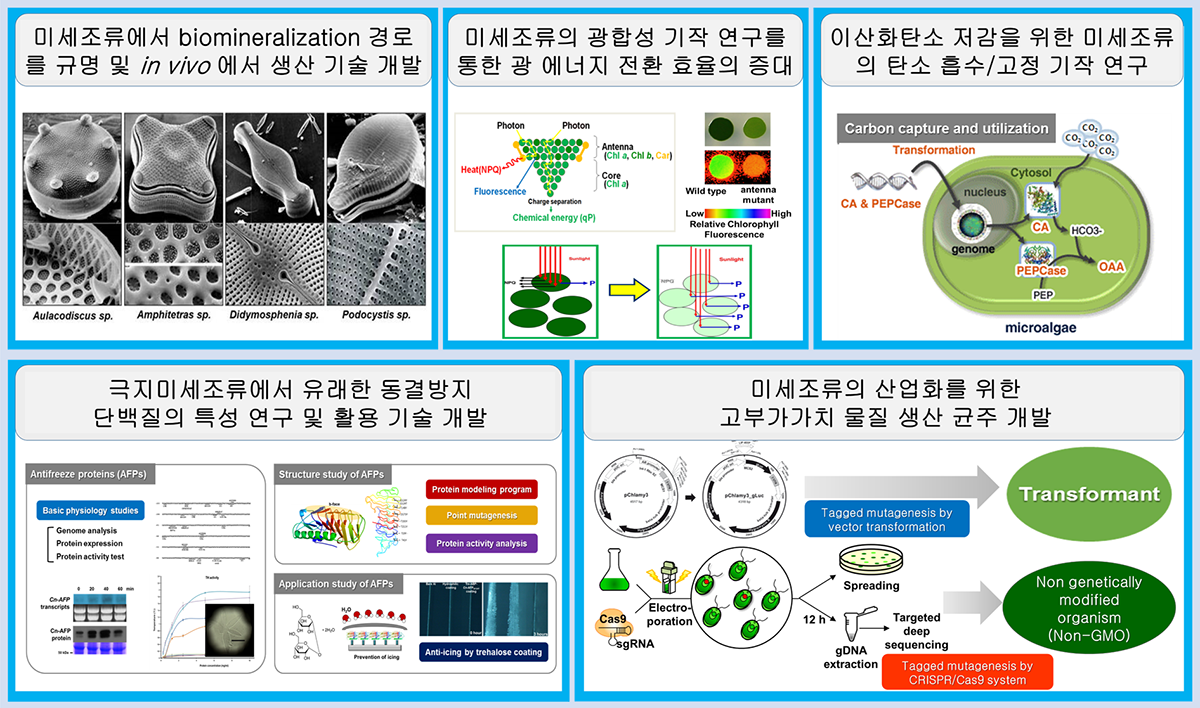 - 미세조류의 탄소 흡수 고정 기작 및 광합성 기작 연구를 통한 생산성 증대 및 광합성 효율 최적화 연구