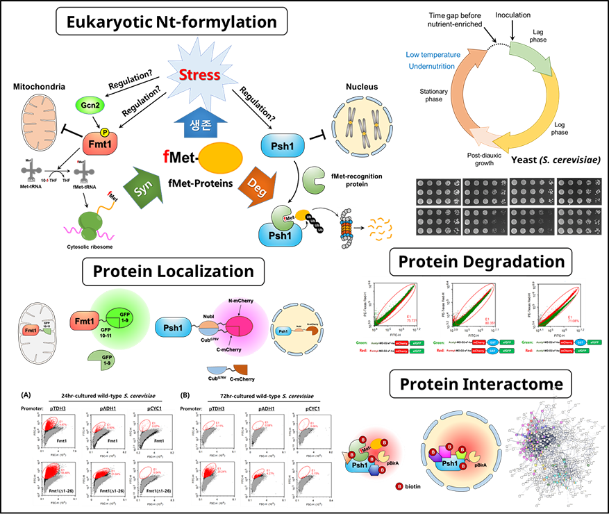 본 연구실에서는 세포가 처한 환경이나 스트레스에 따라 단백질의 운명을 결정하는 신호가 생성 또는 소멸되는 과정과 그 조절 기전, 그리고 단백질 신호의 변화가 세포 내에서 궁극적으로 갖는 생리학적 기능을 연구합니다.